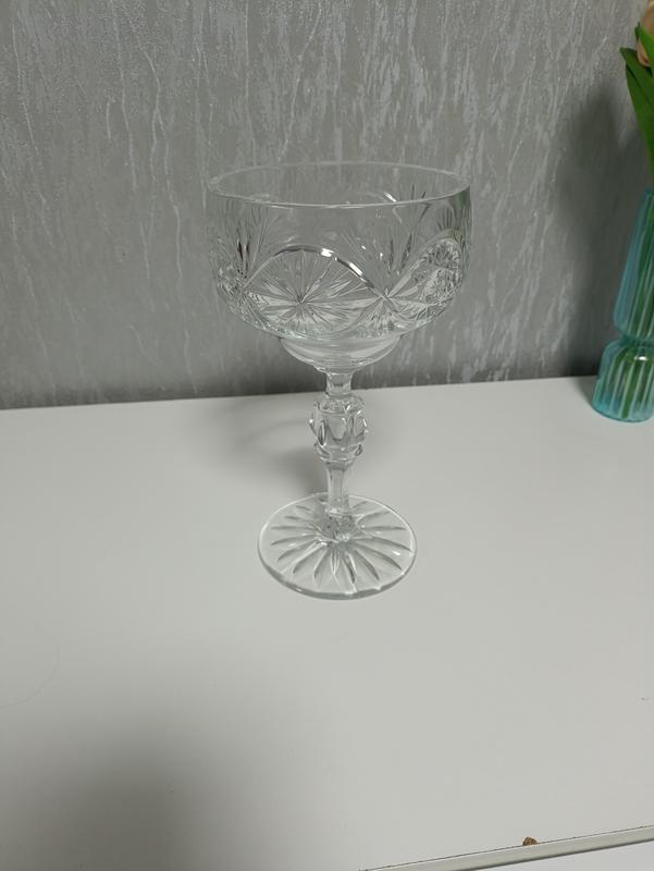 Кришталева цукерниця на високій ніжці виготовлена з натурального кришталю. Висота 21см. Діаметр 12см. Є дуже маленький дефектик на обідку маленька коцка або щось схоже але потрібно дуже придивлятися, на останньому фото вказав. По цій причині ціну знижено на 50%