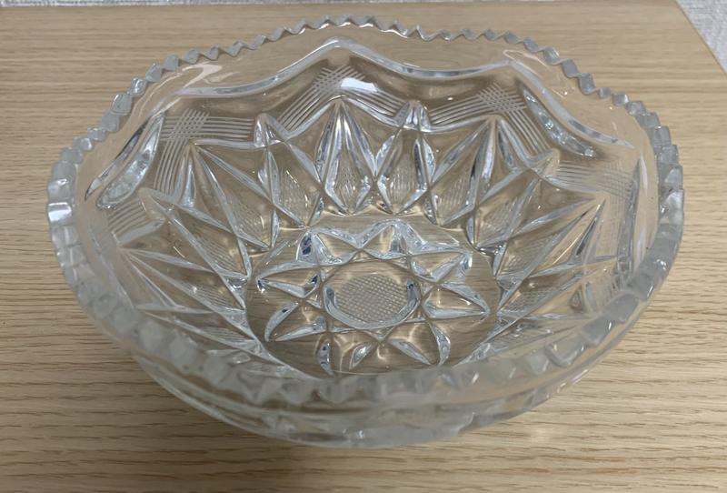 Вишукана скляна посудина для сервірування столу Характеристики: Розміри: • Висота: 6 см • Діаметр: 16 см • Діаметр дна: 6 см Матеріал та дизайн: • Матеріал: прозоре скло (кришталеве скло) • Техніка: гранування, алмазна грань • Візерунок: класичні геометричні зірки та ромби • Край: зубчастий гранований обідок • Колір: прозорий з ефектом заломлення світла Про кришталеве гранування: Особливості техніки: • Класична алмазна грань • Складний багаторівневий візерунок • Ефект заломлення та розсіювання світла • Блиск та сяйво при освітленні • Традиційна техніка обробки скла Використання: Ідеально для: • Цукерок та шоколадних цукерок • Печива та тістечок • Сухофруктів та горіхів • Фруктових салатів • Десертів • Льодяників • Цукру рафінаду • Декоративних предметів Сервірування: • Святковий стіл • Чаювання • Прийом гостей • Декор столу • Буфет та фуршет Переваги: Естетика: • Вишуканий класичний дизайн • Грає на світлі, переливається • Підходить до будь-якого інтер’єру • Додає елегантності столу • Універсальний стиль Практичність: • Зручний розмір для столу • Стійка основа • Легко мити • Не вбирає запахи • Довговічний матеріал Використання: • Щоденне та святкове • Для дому та офісу • Як подарунок • Декоративний елемент інтер’єру Догляд: • Мити вручну теплою водою • Можна використовувати м’які миючі засоби • Витирати м’якою тканиною для блиску • Зберігати акуратно, щоб уникнути сколів Стан: Гарний, чистий, без сколів та тріщин • Прозоре скло без помутнінь • Грані чіткі та рівні • Край без пошкоджень • Дно стійке Стиль та призначення: Підходить для: • Класичного інтер’єру • Вінтажного стилю • Ретро-дизайну • Традиційного сервірування • Колекціонування кришталевого посуду