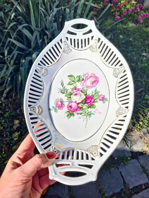 Роскошная ваза, Конфетницы, фруктовница, цветы. Германия. Начало XX века. Цветочный декор, элементы прорезного фарфора, позолота. Длина – 31 см. Прекрасное состояние, с незначительными потертостями позолоты.