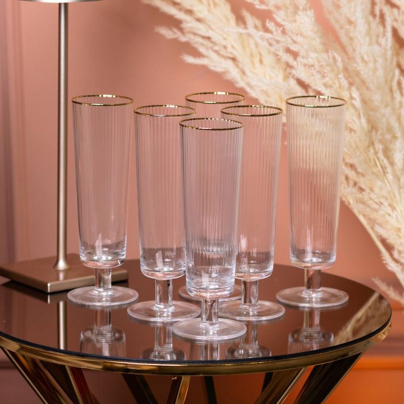 Набор бокалов для шампанского из тонкого стекла ребристые с золотым ободком 300 мл 6 шт