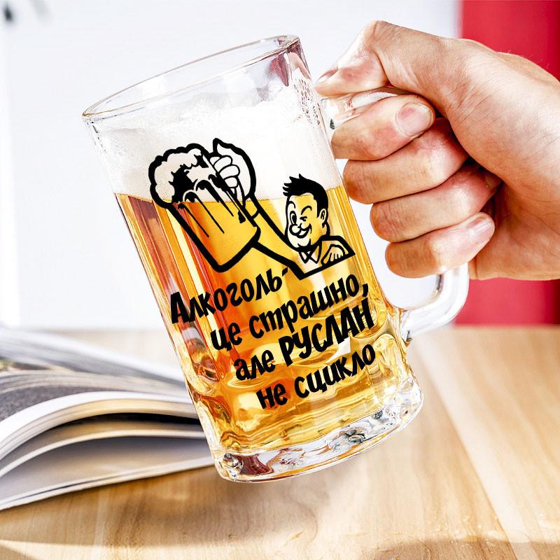 Бокал для пива с надписью "алкоголь - это страшно, но руслан не ссыкло"
