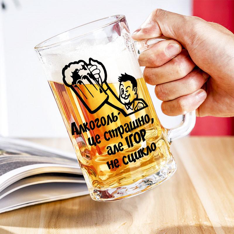 Бокал для пива с надписью "алкоголь - это страшно, но игорь не ссыкло"