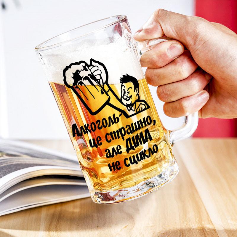 Бокал для пива с надписью "алкоголь - это страшно, но дима не ссыкло"