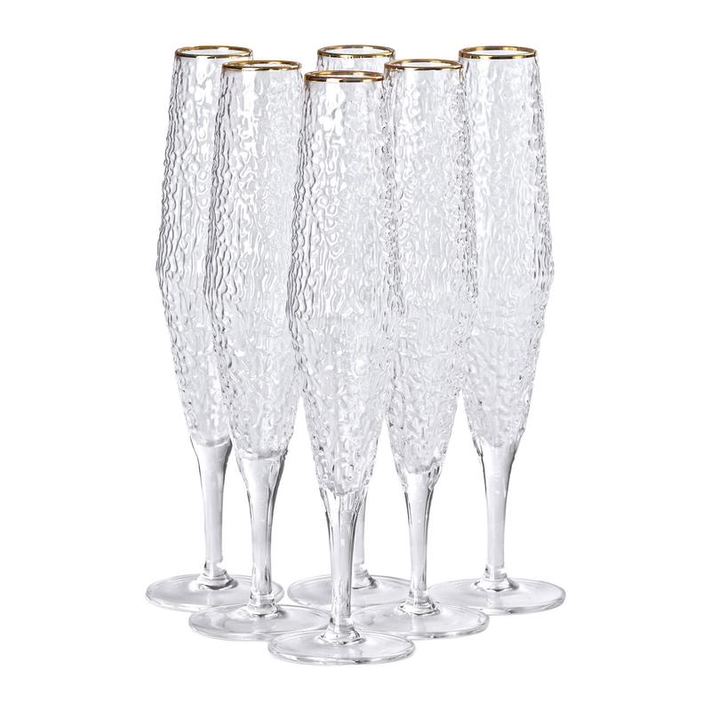 Набор бокалов для шампанского состоит из шести изящных фактурных бокалов объемом 250 мл, выполненных из прозрачного стекла, что позволяет оценить цвет и игристость напитка. Фактурная поверхность придает бокалам уникальность и игриво отражает свет, создавая праздничную атмосферу, а золотой ободок добавляет нотку роскоши и завершенности. Высота бокалов 25 см придает им элегантную вытянутую форму и обеспечивает удобное держание, делая их идеальными для подачи шампанского или других игристых напитков. Характеристики: Количество: 6 штук Объем: 250 мл Высота: 25 см Материал: стекло Особенность: фактурная поверхность Декор: золотой ободок Преимущества: Современный дизайн с золотым декором Идеальный объем 250 мл для шампанского Комфортное держание благодаря вытянутой форме Улучшенные тактильные ощущения Возможность подчеркнуть эстетику и игристость напитка. Уход: Рекомендуется мыть вручную с мягкими моющими средствами, чтобы сохранить блеск и целостность золотого ободка. Избегайте использования абразивных губок и посудомоечных машин, чтобы предотвратить повреждение декора. Храните бокалы в вертикальном положении, чтобы избежать царапин и сколов на поверхности.