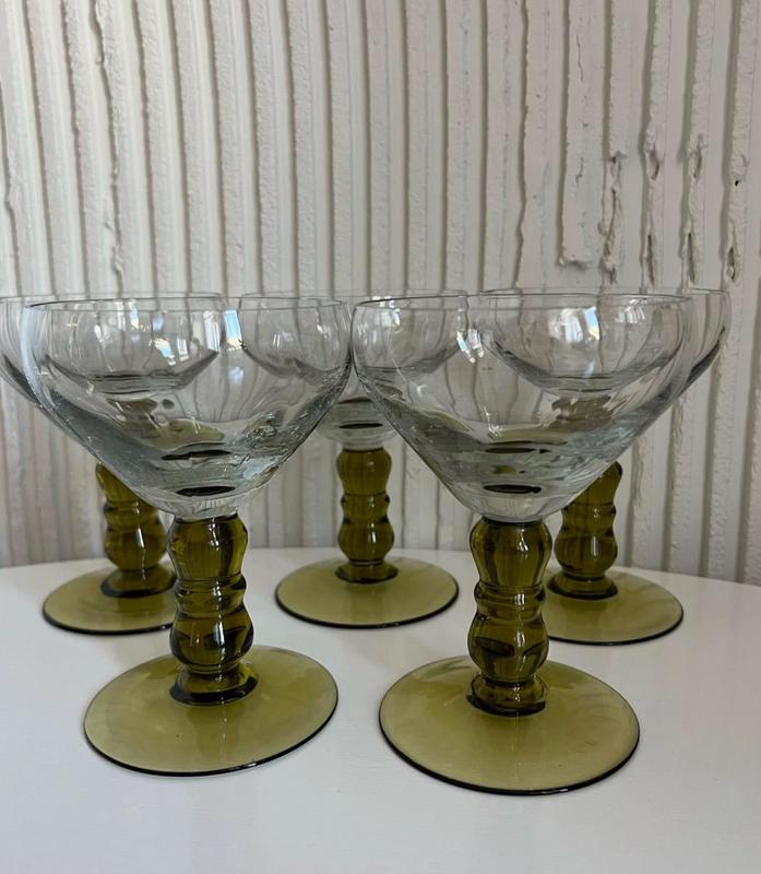 Набір великих винних келихів у римському стилі з ребристою ніжкою зеленого кольору. Вінтажний дизайн середини століття 1970-х років, Німеччина міцний і надійний келих в руці. Прекрасне доповнення до вашої колекції ретро барного посуду. Келихи знаходяться в ідеальному вінтажному стані. Без сколів та тріщин.