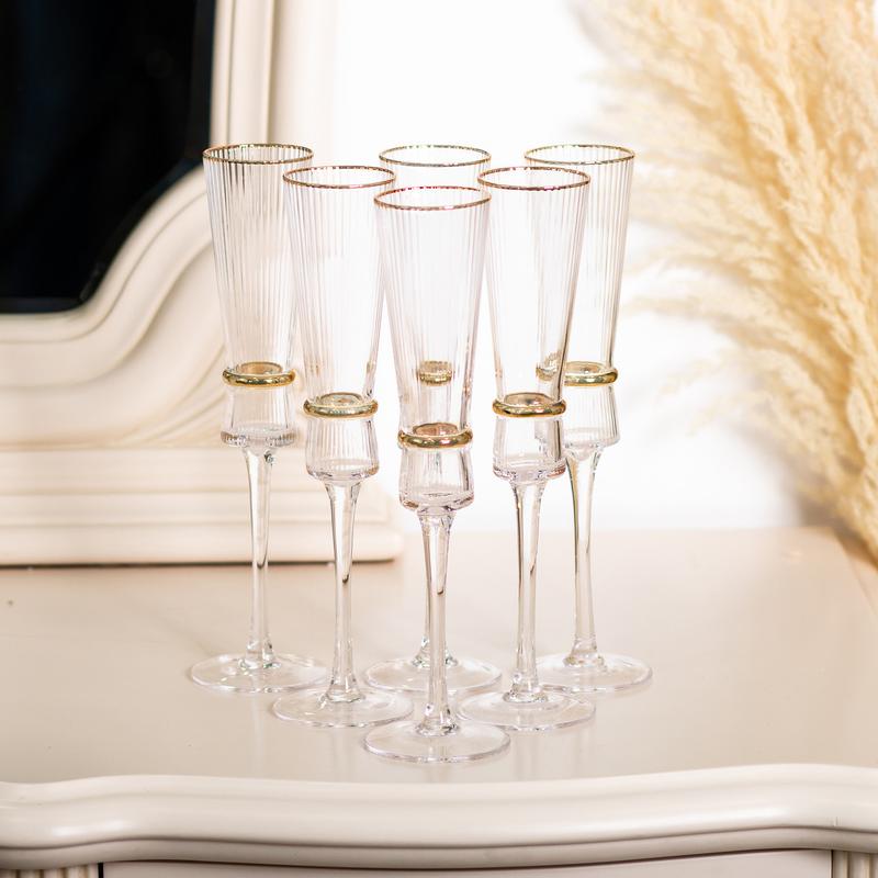 Набор бокалов для шампанского — это идеальное сочетание элегантности и современного дизайна. Каждый бокал с объемом 200 мл идеально подходит для подачи шампанского и других игристых напитков, а прозрачное стекло подчеркивает их цвет и искристость. Золотой ободок придает бокалам роскошный вид, превращая каждый тост в настоящее торжество. С высотой 25,5 см они впечатляюще смотрятся на столе и удобны для держания, что делает их отличным выбором для праздничных событий. Этот набор станет прекрасным дополнением к любой сервировке и отличным подарком для любителей изысканных напитков и стиля. Характеристики: Количество: 6 штук Объем: 200 мл Высота: 25,5 см Материал: стекло Преимущества: Современный стиль с золотым ободком делает бокалы идеальными для торжеств. Объем 200 мл подходит для подачи шампанского и игристых напитков. Высокая форма бокалов создает впечатление стиля. Позволяет оценить цвет и искристость напитка. Подходят для праздничной сервировки и в качестве подарка любителям изысканных напитков. Уход: Рекомендуется мыть вручную с мягкими моющими средствами, чтобы сохранить блеск и целостность золотого ободка. Избегайте использования абразивных губок и посудомоечных машин, чтобы предотвратить повреждение декора. Храните бокалы в вертикальном положении, чтобы избежать царапин и сколов на поверхности.