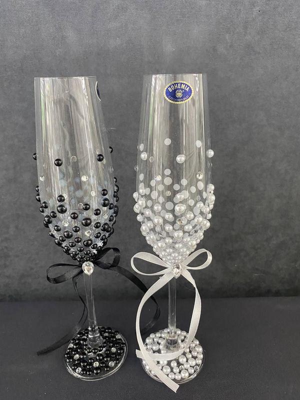 Свадебные бокалы Bohemia 2 шт Стеклянные бокалы свадебные Бокалы для новобрачных Пара декоративных бокалов от чешского бренда Bohemia станет стильным акцентом свадебного торжества. Каждый бокал оформлен вручную, с использованием жемчуга, страз и атласных лент, что придаёт композиции особую изысканность и символичность. Преимущества: - Ручной декор: Украшены жемчугом, сверкающими стразами и атласными бантиками - Символика пары: Один бокал оформлен чёрными вензелями, второй -- белыми, что подчёркивает гармонию и единство - Эстетика праздника: Идеально дополняют свадебную сервировку и создают атмосферу торжественности - Подарочная ценность: Отличный выбор для подарка молодожёнам или на годовщину Характеристики: - Производитель: Bohemia (Чехия) - Материал: Стекло - Тип: Бокалы для шампанского - Количество в наборе: 2 шт - Декор: Жемчуг, стразы, атласные бантики - Цвет декора: Один бокал с чёрным жемчугом, второй -- с белым Свадебные бокалы Bohemia -- не просто аксессуар, а символ любви, гармонии и красоты, который сохранит воспоминания о вашем особенном дне на долгие годы