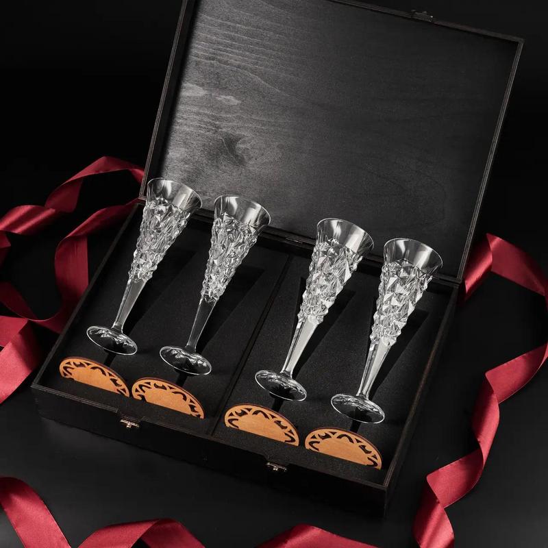 Непревзойденный подарок вашим любимым, близким, друзьям и коллегам Индивидуальная гравировка - это возможность сделать Например: гербы, инициалы, обрамление, приветствие, эмоции 100% детали спрашивайте у менеджера *Выбрать макет из наших шаблонов можно по кнопке ниже. *Также в конце описания по кнопке "Обрати бажаний набір" можете ознакомиться с большим ассортиментом наборов. *напишите в комментариях к заказу, если вам нужна гравировка. Мы вам отпишем. Полное описание набора: - Черная коробка из натурального дерева: 48 × 34 × 11 см см со стандартным гравировкой WINE PREMIUM SET на внешней стороне, перевязанная лентой; - 4шт - бокалы; - 4шт - элегантные деревянные костеры под бокалы; - Ложемент создан индивидуально под бокалы. Самый большой ассортимент наборов и видов