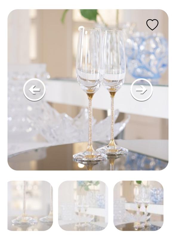 Характеристики Бокалы: Для шампанского У комплекті: 2 шт Дизайнер: Steven Weinberg Коллекция: Crystalline Материал: Хрусталь Объем: 214 мл Производитель: Австрия Размер: 25,6 см * 6,9 см * 6,9 см Цвет: Золотистый Эти два нежных, элегантных и очень праздничных бокала окутывают блеском торжественное застолье. Позолоченный металл и 220 кристаллов цвета Golden Shadow в ножках бокалов наполнят вечер романтикой.