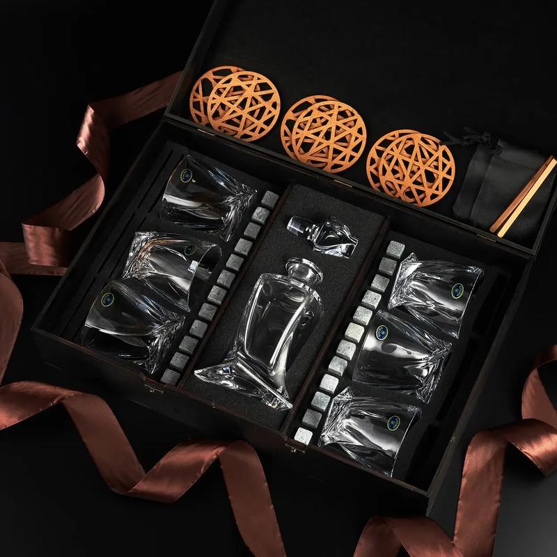 Бокалы и камни для виски с гравировкой Bohemia Quadro 340 мл Этот набор станет изысканным подарком для любимых, близких, друзей или коллег -- для тех моментов, когда хочется подарить не просто вещь, а эмоцию и атмосферу. Продуманная комплектация и элегантное оформление делают его достойным выбором для праздников, юбилеев и важных событий. - По желанию набор можно дополнить индивидуальной гравировкой. Имя, дата или пожелания придадут подарку личный смысл и подчеркнут его уникальность. - Все элементы аккуратно размещены в черной коробке из натурального дерева размером 51 × 34 × 14 см. Коробка перевязана лентой и украшена стандартной гравировкой WHISKY STONES, что придает набору солидный и премиальный вид. Комплектация набора: - графин для виски на 500 мл; - 6 стильных стаканов на 340 мл; - 6 деревянных костеров для защиты поверхностей; - 24 стеатитовые камушки для охлаждения виски без разбавления; - деревянные щипцы для удобного и безопасного использования камушков; - 2 кожаных мешочка для хранения камушков; - инструкция по использованию. Для заказа гравировки оставьте личный лист или напишите нам.