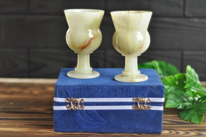 Матеріал: Натуральний камінь онікс Розмір чарок: Висота 12.5 см, діаметр 7.5 см Країна виробник: Пакистан просимо звернути увагу! коробка не несе естетичний характер, вона для транспортування!