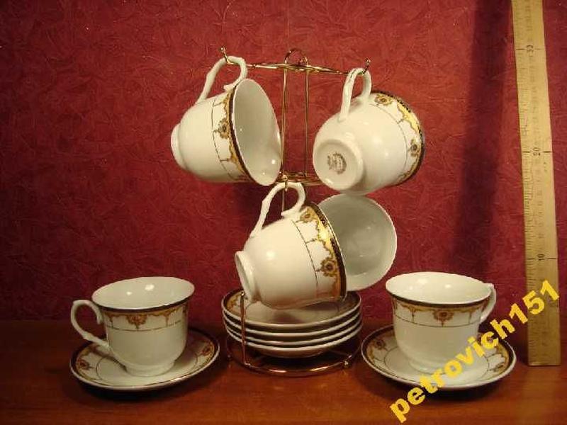 Чайный Набор Фарфор Подставка Металл Новый 1 ПОДСТАВКА. 6-БЛЮДЕЦ (ДИАМЕТР 13,5 СМ.); 6- ЧАШЕК (ВЫСОТА 7 СМ. );