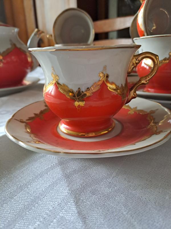 Чудесный коллекционный сервиз Красный бутон Барановского ФЗ. Барановский фарфоровый завод основан 1802 году , производство фарфоровых изделий остановилось окончательно в 2010 году , а чайный сервиз Бутон практически не изготавливался с 1990 года ,Сервиз куплен 1980 году. Рельефный рисунок расписан вручную, богатое золочение. Состояние очень хорошее,использовался очень мало и то пару предметов, без сколов, трещин, склейки и реставрации, в основном сервантное хранение, есть незначительные нюансы, на сахарнеце и одном заварнике немного стёрто золото на ручке крышечки и пару чашек использовались недолго - видно по ободку.. (указала на последних 2 фото) если нужны ещё фото ,то предоставлю , В сервиз входят : чайник заварной 2 шт сахарница, сливочник, 12 блюдец и 10 чашек.
