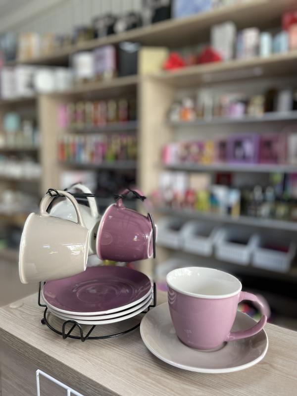 В набор входит 4 чашки и 4 блюдца, подставка металлическая