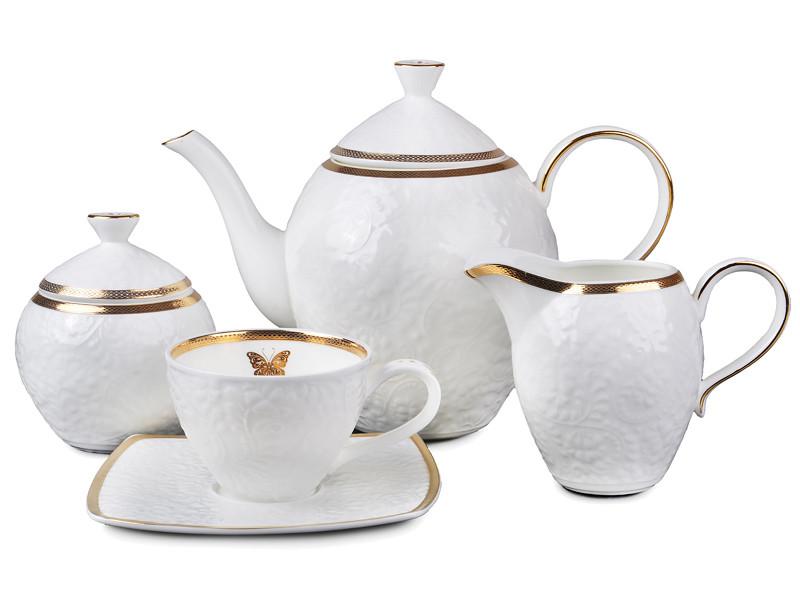 Чайный сервиз Lefard 586-324 15 предметов Чайный сервиз Lefard 586-324 изготовлен из фарфора который обладает особой прочность, долго держит тепло и является экологически чистым материалом. Кружки очень просты в уходе, они легко моются под проточной водой. В набор входит 6 кружек и 6 блюдец. Характеристики: - Тип: чайный сервиз - Материал: фарфор - Количество персон: 6 - Количество предметов: 15 - Цвет: разные цвета - Производитель: Lefard Комплектация: - Чашка: 6 шт - Блюдце: 6 шт - Сахарница: 1 шт - Заварочный чайник: 1 шт - Молочник: 1 шт