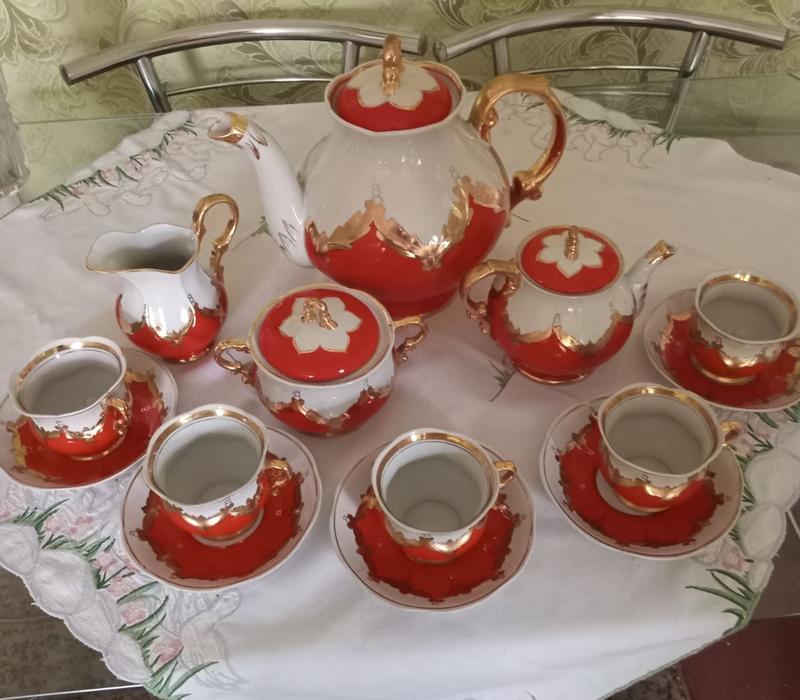 Фарфоровый сервиз красный Бутон с позолотой Состояние отличное. Без сколов или трещин. - Большой чайник 3 литра 26 см - заварник 13 см сахарница 12 см сливочник 14 см 5 чашек высота 7 см диамер 8 см 5 блюдец диамерт 14 см Оригинальная ручная роспись сусальным золотом. * Тонкий фарфор. Отпрака Новой почтой с полной предоплатой на карточку ПриватБанка.