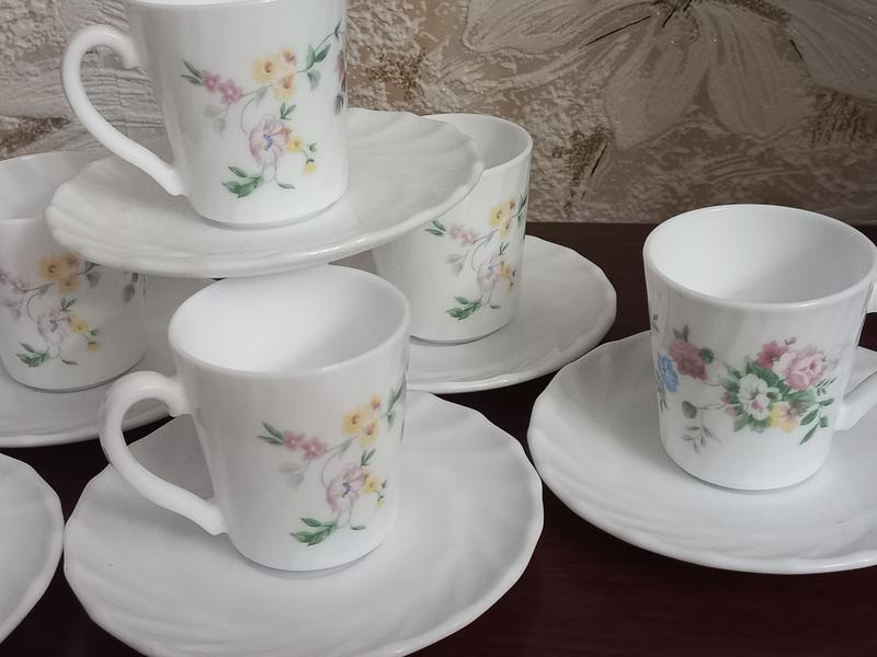 Комплект из 12 единиц: 6 блюдец + 6 чашек. Очень хорошее состояние. В пользовании не был. Видно по состоянию поверхности предметов. Потертостей нет. Стеклокерамика. Нежный цветочный рисунок в пастельных тонах. Чашка 3 oz, примерно 85-88 мл. Высота чашки 63 мм. Блюдце диаметр 11,5 см. Франция, винтаж.