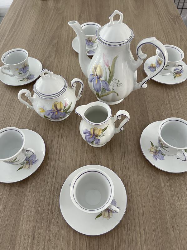 Дуже гарний кавовий набір для еспресо на 6 осіб. Розмальований в ніжні іриси. Yugoslavia Zajecar. В цурорниці приклеєна одна ручка (останнє фото), взагалі не помітно. Все інше в ідеальному стані.