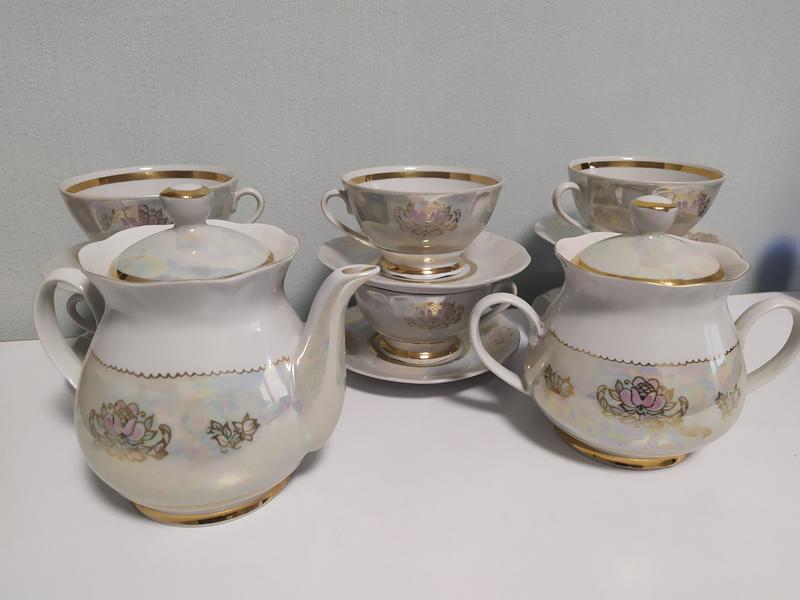 Чайный червяз Кремгес Светодиодского фарфорового завода в составе: чайник, сахарница, 6 чашек, 6 блюдец. На чайнике есть незначительный скол под ободком, на фото видно. В целом хорошее состояние, позолота не затертая, фарфор немного просвечивается