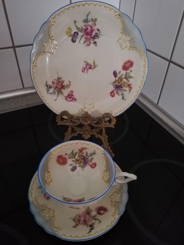 Антикварное трио фарфоровое для чая/кофе клеймо Heinrich Winterling in Marktleuhen это клеймо ставилось в период с 1903 года по 1945год трио изготовлено в 30годах,так как до окончания войны был введен строгий запрет на использование золота при росписи фарфора элегантная форма,рельеф очерчен голубым цветом,голубые медальоны,ручная роспись 1) Чашка на фигурной ножке,изумительная ручка высота 6,5см Ø верха 10,8см 2) Блюдце Ø 15,5см. 3) Десертная тарелка Ø 20см. антиквариат,довоенная