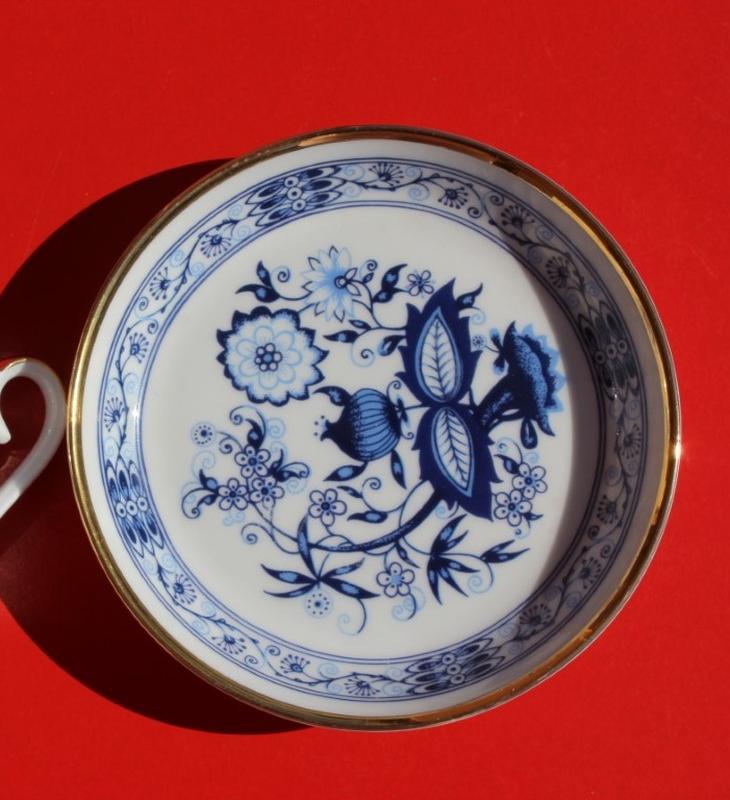 Блюдце виготовлене з порцеляни із золотим обідком. Виробник Royal Franconia (Барія, Німеччина). Це традиційний дизайн Blue Onion ексклюзивно виготовлений для Danbury Mint. Розміри: висота — 2 см, Ø — 11 см