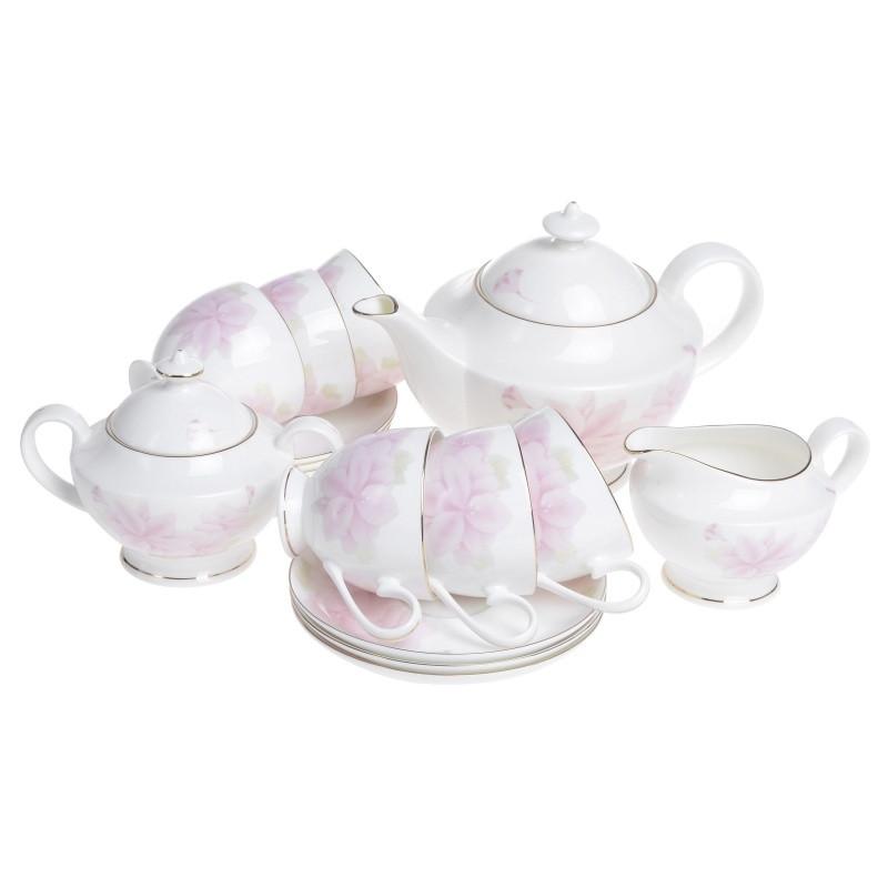 Чаювання може сприйматися як звичайне повсякденне заняття. Ми звикли починати свій день з чашки чаю або насолоджуватися гарячим напоєм вечорами. Такий простий і одночасно особливий процес став певним символом домашнього затишку. Чайний сервіз виготовлений з кістяної порцеляни, який відрізняється вишуканістю. Вироби з цього матеріалу мають тонкі стінки, що виглядає дуже вишукано. Всі предмети в сервізі декоровані золотистою облямівкою і квітковим візерунком ніжного рожевого кольору. Чайний сервіз з кістяної порцеляни стане прекрасним подарунком для ваших близьких. Всі елементи можна купити окремо. У набір входять 15 предметів: 1.Чайник, об'ємом 1300 мл – 1 шт. 2. Цукорниця, об'ємом 350 мл – 1 шт. 3. Молочник, об'ємом 310 мл – 1 шт. 4. Чашка, об'ємом 240 мл – 6 шт. 5. Блюдце, діаметром 15,5 см – 6 шт.
