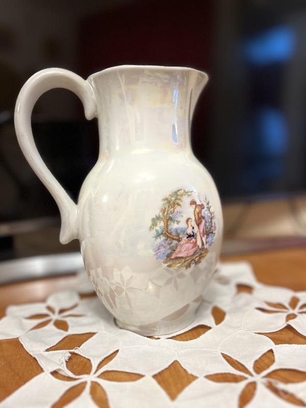 Пропоную вишуканий вінтажний керамічний кувшин з перламутровим покриттям і мальовничим зображенням пари у старовинному стилі. Дуже гарний декоративний предмет — ідеально для інтер’єру, фотозон або подарунку. 📌 Характеристики: ▪️ Матеріал: кераміка / фарфор ▪️ Покриття: перламутрова глазур (люстер) ▪️ Малюнок: пасторальна сцена (репродукція класичного сюжету XVIII ст.) ▪️ Висота: ≈ 20–22 см (орієнтовно) ▪️ Стан: чудовий, без тріщин і сколів ✨ Стильно виглядає в класичних та вінтажних інтер’єрах. Також може використовуватись як ваза або елемент сервірування.