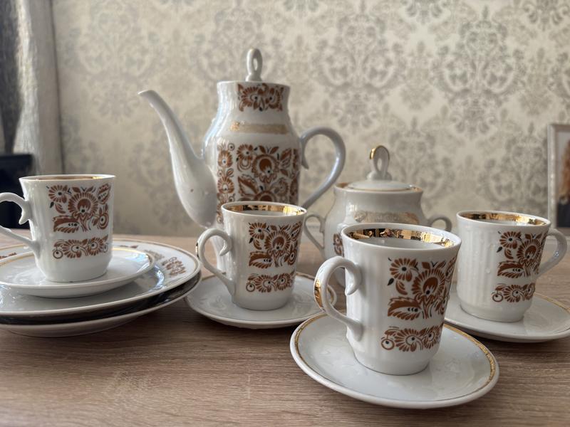 Чайник для кави, чашки, блюдця, десертні тарілки, цукорниця.