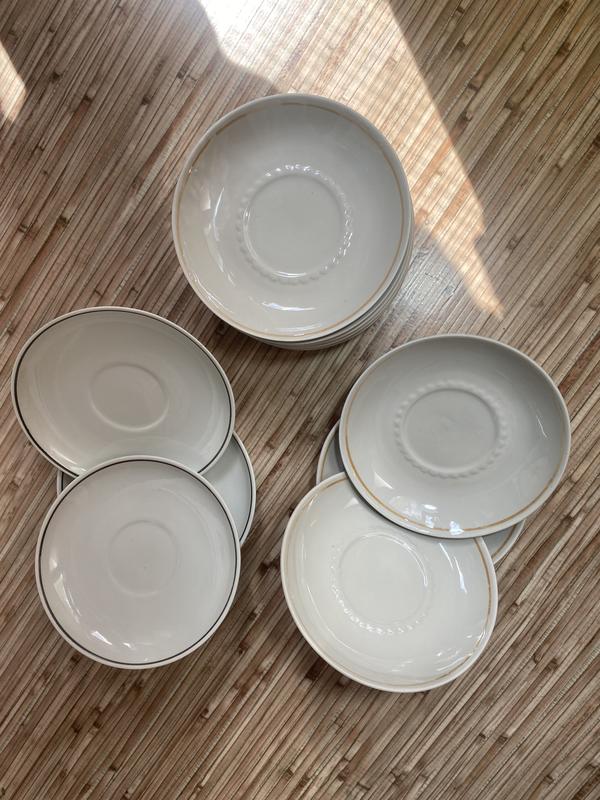 Блюдця нові, дбайливо зберігались В наявності 12 шт( не комплект) 3+9 Фото 2,3- колір білий, полоска темна Діаметр 14,2 см- 3 шт Фото 4,5- колір кремовий, полоска під золото, діаметр 13,8 см- 9 шт Ціна вказана за одиницю