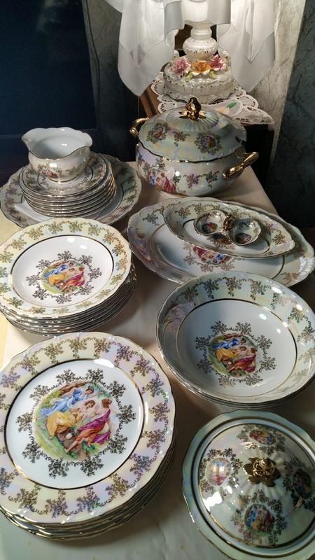 Шикарный столовый сервиз из тонкого фарфора производства Чехии. Новый, в упаковке. В составе 18 тарелок разного предназначения, двух салатников, блюд круглой и овальной формы, супницы, маслёнки и т.д. Всего 28 предметов.