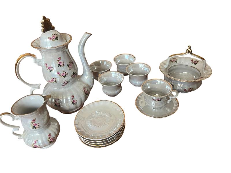 Мініатюрний набор для кави. Налічує 14 предметів. З позолотою. Чайник, цукорниця, сливочниця, 6 блюдець та 5 чашок. Має візерунок схожий на візерунок бренду Faragon Fragranse