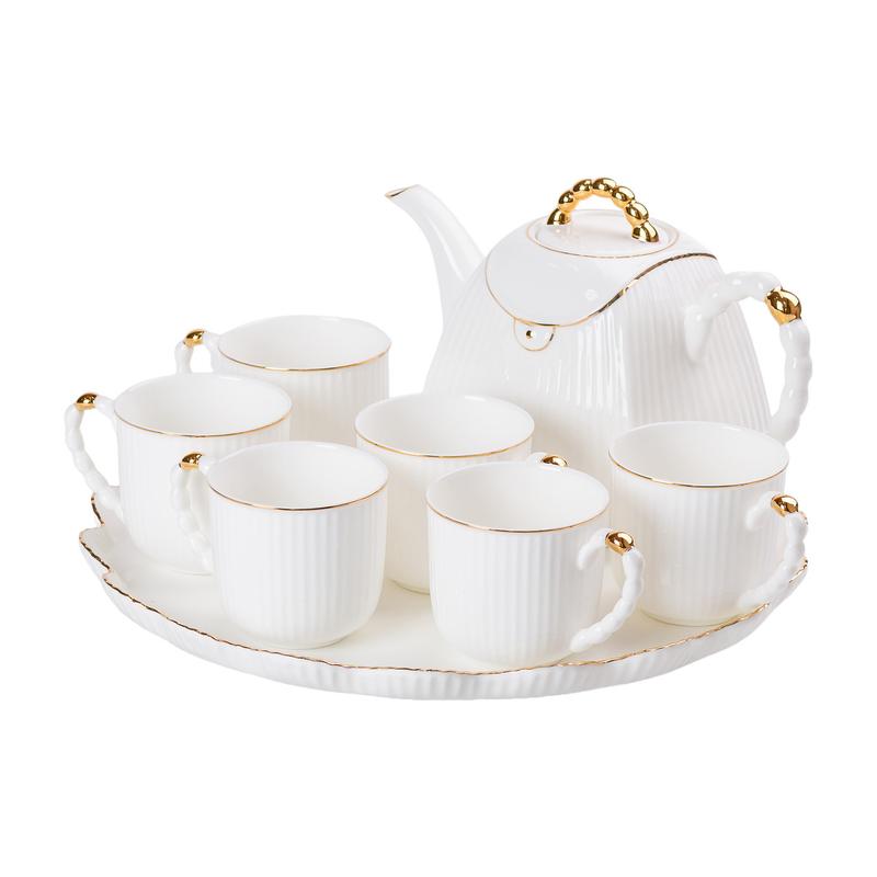 Чайный сервиз — это элегантный фарфоровый набор на 6 персон, выполненный в современном стиле. Он включает в себя белый чайник объемом 1,5 литра, шесть чашек по 300 мл и элегантный фарфоровый поднос. Каждый элемент сервиза декорирован золотым ободком, что придаёт набору изящества и роскоши. Характеристики: Материал: Фарфор Количество персон: 6 Количество предметов: 8 Объем чайника: 1,5 л Объем чашек: 300 мл Преимущества сервиза: Современный дизайн: Элегантный стиль с золотыми ободками придаёт набору изысканный и роскошный вид. Комплектация: Набор на 6 персон позволяет удобно принимать гостей и устраивать чаепития. Практичность: Включает чайник и поднос, что упрощает сервировку и подачу чая. Долговечность: Изготовлен из высококачественного фарфора, что обеспечивает долгий срок службы. Универсальность: Белый цвет с золотыми деталями легко вписывается в любой интерьер, подходя для различных случаев.