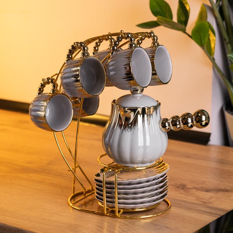 Элегантный кофейный сервиз на металлической подставке сочетает в себе стиль и функциональность. В набор входят шесть изящных чашек и кофейник, аккуратно размещенные на золотистой подставке, что обеспечивает удобство хранения и красивую презентацию. Чашки выполнены из высококачественного фарфора с оригинальной золотой отделкой, которая придает набору роскошный вид. Кофейник гармонично дополняет чашки, его удобная ручка и крышка обеспечивают комфортное использование и безопасное наливание горячего напитка. Основные характеристики кофейного сервиза на металлической подставке Объем чашки: 90 мл; Объем кофейника: 450 мл; Размер набора: 22×13×28 см; Материал: фарфор, металл. Металлическая подставка надежно фиксирует все элементы, позволяя экономно использовать пространство и демонстрируя сервиз как стильный декоративный элемент. Такой набор отлично подойдет как для повседневного использования, так и для подачи кофе гостям в праздничные моменты.