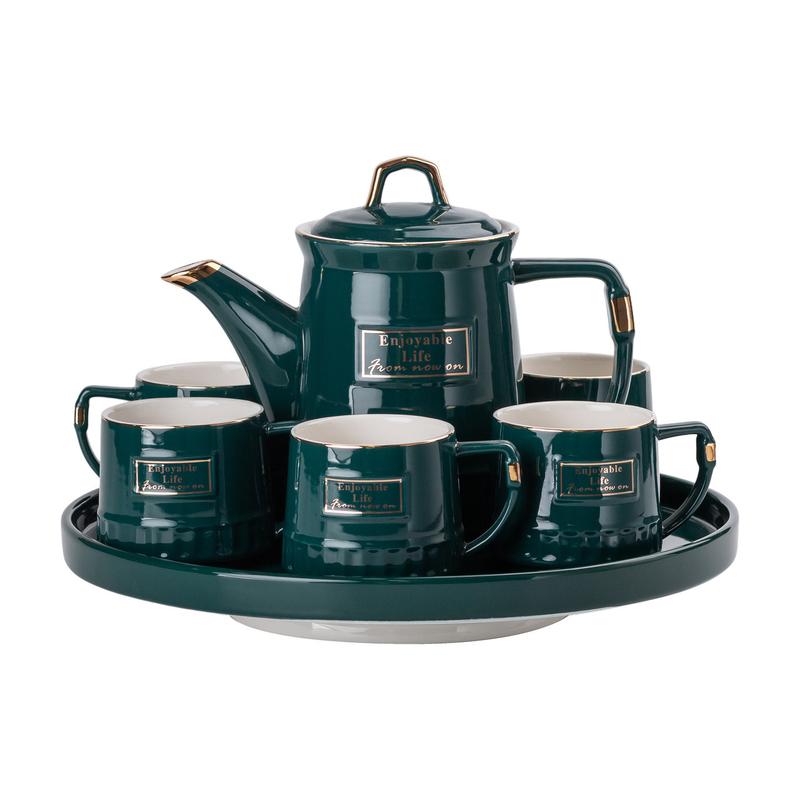 ## Чайный набор на 6 персон с чайником и керамической подставкой для чаепития и сервировки DM-11 Чайный сервиз на 6 персон состоит из 8 предметов и выполнен в стильный цвет. Набор содержит 6 чашек объемом 300 мл, чайник емкостью 1,5 литра и поднос, что обеспечивает удобство в сервировании. Все элементы изготовлены из качественной керамики, что гарантирует долговечность и эстетическую привлекательность. Этот сервиз идеально подходит для чаепитий. компании друзей или семьи. Благодаря гармоничному сочетанию практичности и стильного дизайна, он станет изюминкой любого стола и добавит уют каждому чаепитию. Характеристики: - Количество предметов: 8 - Комплектация: 6 чашек, 1 чайник, 1 поднос, - Материал: керамика - Емкость: чайник – 1.5 л, чашки – 300 мл Преимущества сервиза: - Стильный дизайн: Современный цвет придает набору элегантный и утонченный вид. - Комплектация: Включает все необходимые элементы для удобного чаепития, что делает его практичным выбором. - Долговечность: Изготовлен из высококачественной керамики, что обеспечивает долгий срок службы. - Удобство сервировки: Наличие подноса позволяет легко подавать чай и закуски. - Универсальность: Стильный внешний вид делает его пригодным для различных мер и случаев. Наименование Ед.Изм. Значение МатериалКерамика Тип сервизаЧайно-кофейный Количество человек6 Количество предметов8 Объем чайника1.5 л Объем чашки чайной300 мл ЦветЗеленый Чайник1 Подходить для мытья в посудомоечной машине.Нет Подарочная упаковкаНет Чашка чайно6 Поднос1 Гарантия14 дней Успейте заказать, количество штук по акции ограничено! Остерегайтесь подделок и низкокачественного товара, его сейчас очень много представлено под видом oригинaлa! Мы предлагаем высочайшее добротное качество товара на рынке Украины, который выполняет свою функцию и от которого вы будете получать только приятные эмоции. Почему покупают именно у нас? Отзывы и рекомендации реальных клиентов Наш магазин имеет многочисленные положительные отзывы от довольных клиентов. Вы можете ознакомиться с их опытом и рекомендациями в описании ниже и на нашем сайте, что поможет вам сделать обоснованный выбор. Прозрачность и честность Мы ведем открытую и честную политику в отношениях с клиентами и всегда идем навстречу. Все характеристики товаров, условия гарантии и обмена четко указаны на нашем сайте, что позволяет избежать недоразумений и обеспечивает доверие клиентов. Легкая система возврата товаров Мы понимаем, что иногда товар может не подойти Вам по тем или иным причинам. Поэтому мы предлагаем гибкую и прозрачную систему возврата товаров, что обеспечивает вам спокойствие и уверенность в вашей покупке. Высокий уровень обслуживания клиентов, 10 лет опыта Наши специалисты всегда готовы предоставить профессиональную консультацию и помощь в выборе товара. Мы ценим каждого клиента и стремимся сделать процесс покупки максимально комфортным и приятным. Быстрая доставка и удобные условия оплаты Мы предлагаем быструю и надежную доставку по всей стране, а также разнообразные способы оплаты, включая наличный и безналичный расчет. Наши клиенты могут выбрать наиболее удобный для себя способ получения товара. ✅ Весь товар проверяется на наличие брака перед отправкой ✅ Отзывы наших клиентов Поторопись, товара по акции осталось всего 3шт! ✅ С заботой о каждом клие