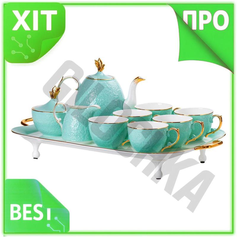 Ve чайный сервиз на 6 new version персон фарфоровый бирюзовый для чаепития с золотыми обод...