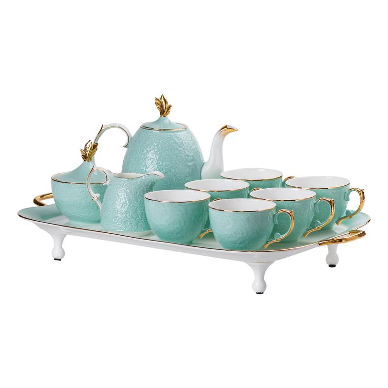 Чайный сервиз — это элегантный фарфоровый набор для чаепития на 6 персон, выполненный в изысканном бирюзовом цвете. В комплект входят чайник объемом 1,2 литра, шесть чашек по 250 мл, а также емкости для сахара и молока по 300 мл каждая. Каждый элемент сервиза декорирован золотым ободком, придающим ему роскошный и утончённый вид. Этот сервиз прекрасно подходит для изысканных чаепитий, объединяя красоту и практичность элегантности. Характеристики: Материал: Фарфор Количество персон: 6 Объем чайника: 1,2 л Объем чашек: 250 мл Емкость для сахара: 300 мл Емкость для молока: 300 мл Цвет: Бирюзовый Преимущества сервиза: Изысканный дизайн: Бирюзовый цвет с золотыми ободками придаёт набору роскошный вид. Практичность: Емкости для сахара и молока обеспечивают удобство во время чаепития. Комплектация: Набор на 6 персон позволяет принимать гостей без лишних хлопот. Долговечность: Изготовлен из высококачественного фарфора, что гарантирует долгий срок службы. Универсальность: Подходит как для повседневного использования, так и для торжественных мероприятий.