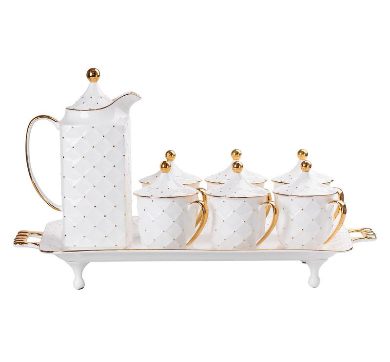 Чайный сервиз из фарфора на 6 персон — это изысканный комплект из 8 предметов, который включает чайник объемом 2 литра, шесть чашек объемом 400 мл и фарфоровый поднос на ножках. Каждый элемент выполнен в белом цвете с золотистой отделкой, что придаёт сервизу утончённый вид. Особенностью данного набора являются крышки для чашек, которые помогают сохранить тепло напитка и обеспечивают дополнительный комфорт во время чаепития. Этот сервиз сочетает в себе практичность и элегантность, делая его идеальным выбором как для приёма гостей, так и для уютных семейных посиделок. Характеристики: Материал: Фарфор Количество персон: 6 Количество предметов: 8 (чайник, 6 чашек с крышками, поднос на ножках) Объем чайника: 2 л Объем чашек: 400 мл Практичность: Изысканный дизайн: Белый фарфор с золотистой отделкой придаёт элегантность любому столу. Крышки для чашек сохраняют тепло напитка, увеличивая комфорт чаепития. Комплектация: Набор на 6 персон обеспечивает достаточное количество посуды для больших компаний. Долговечность: Изготовлено из высококачественного фарфора, что гарантирует длительный срок службы. Универсальность: Подходит для различных случаев — от семейных ужинов до праздничных чаепитий.