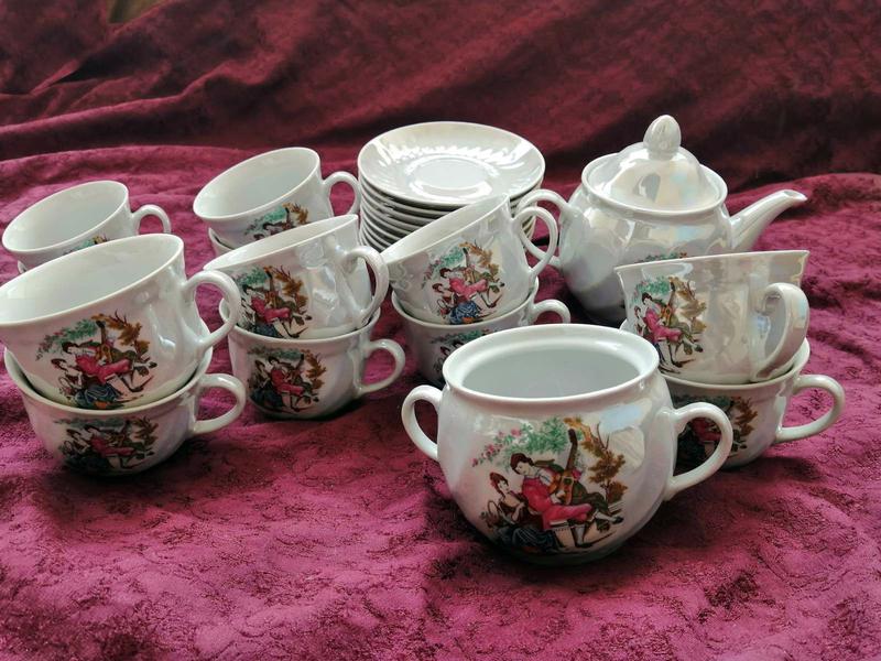 Сервиз новый, долго лежал в серванте, никто не пользовался. Без дефектов. Красивый перламутровый фарфор. С делано в Украине. Год выпуска: 90-е. В наборе 26 предметов: 12 чашек, 12 тарелок, заварник, сахарница. Чашки на 200 мл. только самовывоз в Киеве