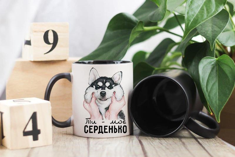 Коли горнятко "холодне" воно чорного кольору, принт не видно. При наливанні кип'ятку стає білим, з'являється принт. Коли охолоджується становиться знову чорним. Матеріал кераміка, об'єм 330мл.