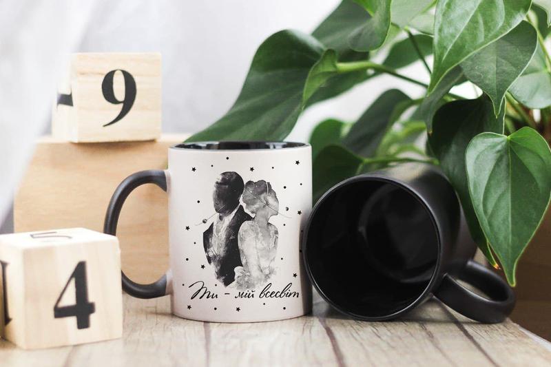 Коли горнятко "холодне" воно чорного кольору, принт не видно. При наливанні кип'ятку стає білим, з'являється принт. Коли охолоджується становиться знову чорним. Матеріал кераміка, об'єм 330мл.