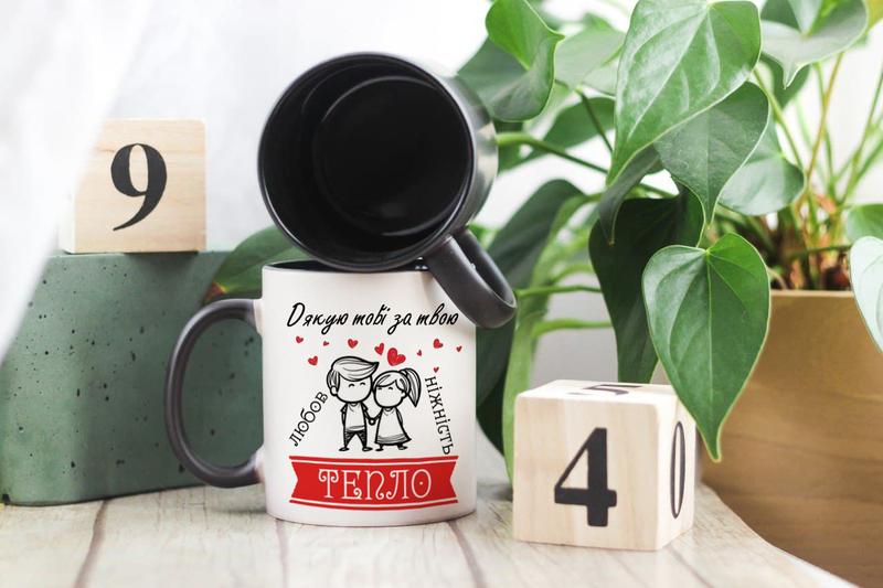 Коли горнятко "холодне" воно чорного кольору, принт не видно. При наливанні кип'ятку стає білим, з'являється принт. Коли охолоджується становиться знову чорним. Матеріал кераміка, об'єм 330мл.
