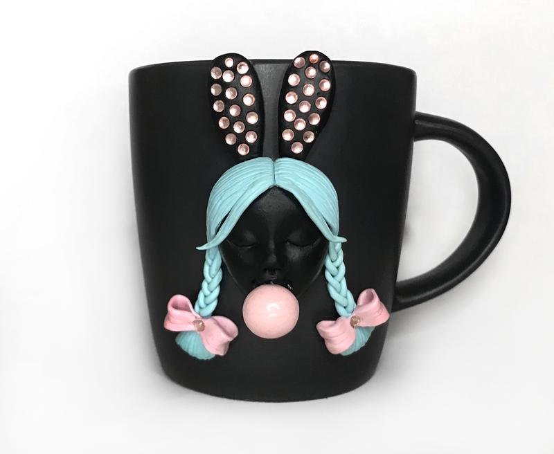 В наличии нет, под заказ 10-14 дней. Декоративная чашка 350 мл. Девочка с ушками зайчика и жвачкой из полимерной глины. Отправляю Новой или Укр почтой. Будут вопросы - пишите :)