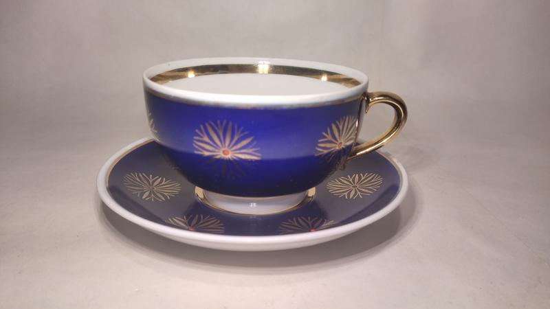 Красивая чайная пара Снежинка кобальтового цвета производства Довбышского ФЗ в хорошем состоянии, без трещин и сколов. Высота 56, диаметр 96 мм, объем 180 мл. В некоторых местах потерта позолота. В наличии 5 пар, цена указана за 1. Задавайте вопросы, смотрите другие объявления, есть другая винтажная посуда!