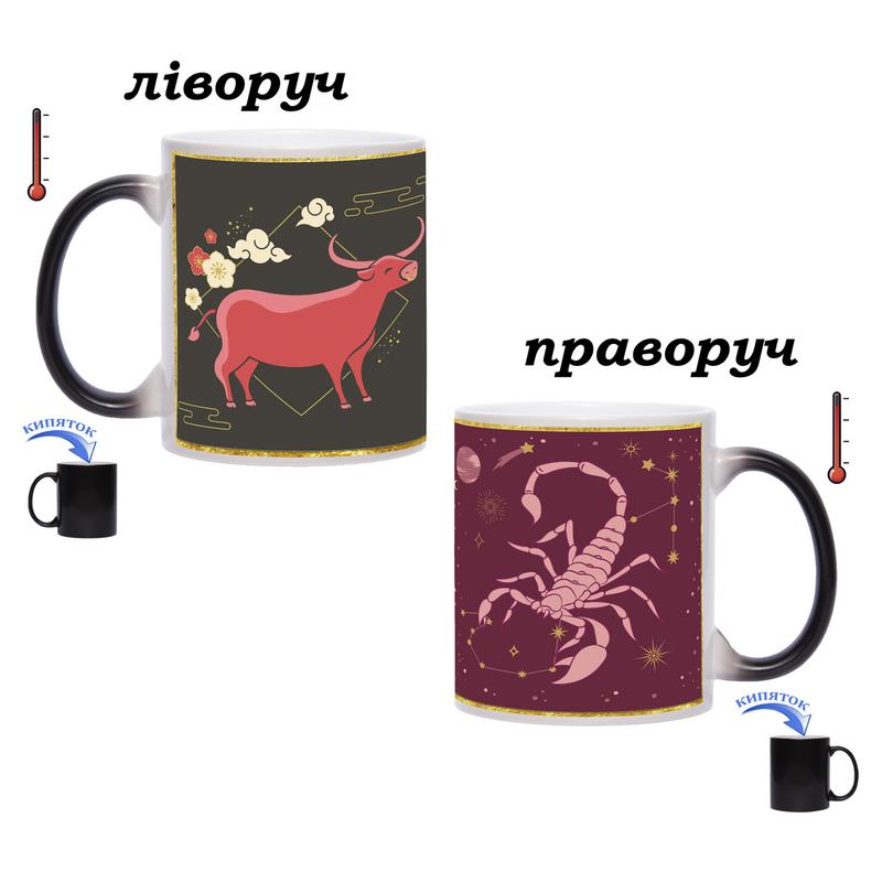 Чашка хамелеон - оригинальный подарок для Ваших друзей, коллег и близких людей. При наполнении кипятком, на чашке хамелеон с одной стороны проявляется удивительное изображение восточного знака Бык, а с другой стороны - знака зодиака Скорпион. Это креативная чашка со знаками 2 в 1 - знаком по восточному (китайскому) гороскопу года и астрологическому знаку. Вам остаётся только подобрать нужное сочетание года и знака зодиака! Данная чашка будет стильным подарком к любому празднику. Сделайте обычное чаепитие ярким и интересным с чашкой хамелеон!