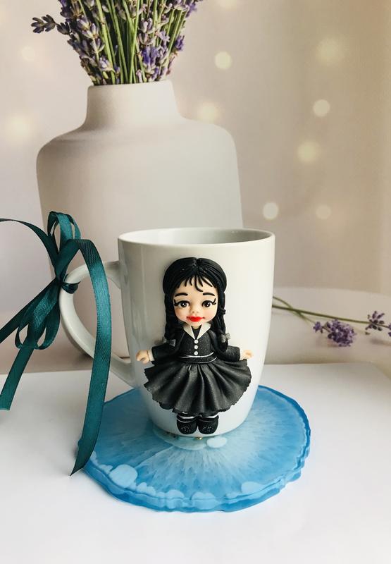 Весьма популярный персонаж, среди девочек, Уэнздей. Преподнесите незабываемый подарок, который будет радовать обладателя, каждый день. Декор выполнен из полимерной глины, не боится воды и горячих напитков. Чашечка объёмом 350 мл