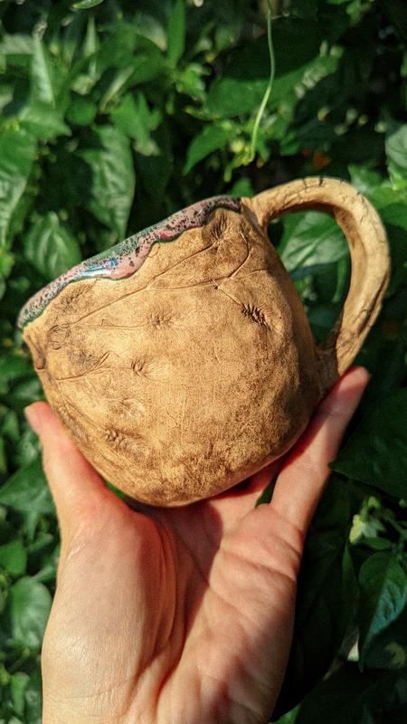 Чашка ручной работы снаружи молочение, внутри глазурь 255 мл отпечаток растений