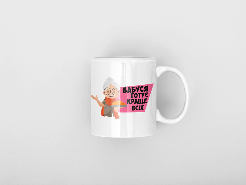 Белая чашка (кружка) с оригинальным принтом "бабуся готовит лучше всех" push it