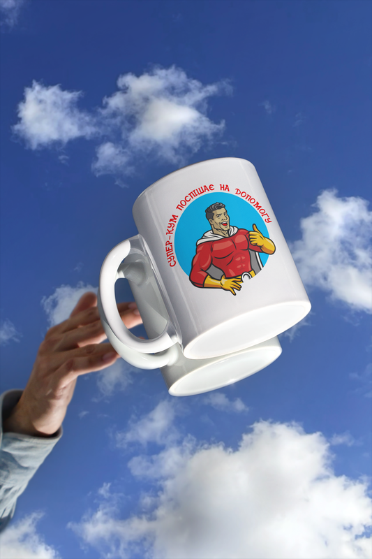 Белая чашка (кружка) с оригинальным принтом "супер-кум спешит на помощь" push it