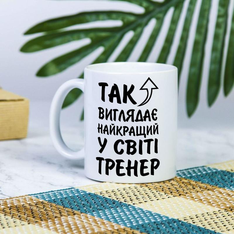 Белая чашка на подарок с надписью "так выглядит лучший тренер в мире." 330 мл