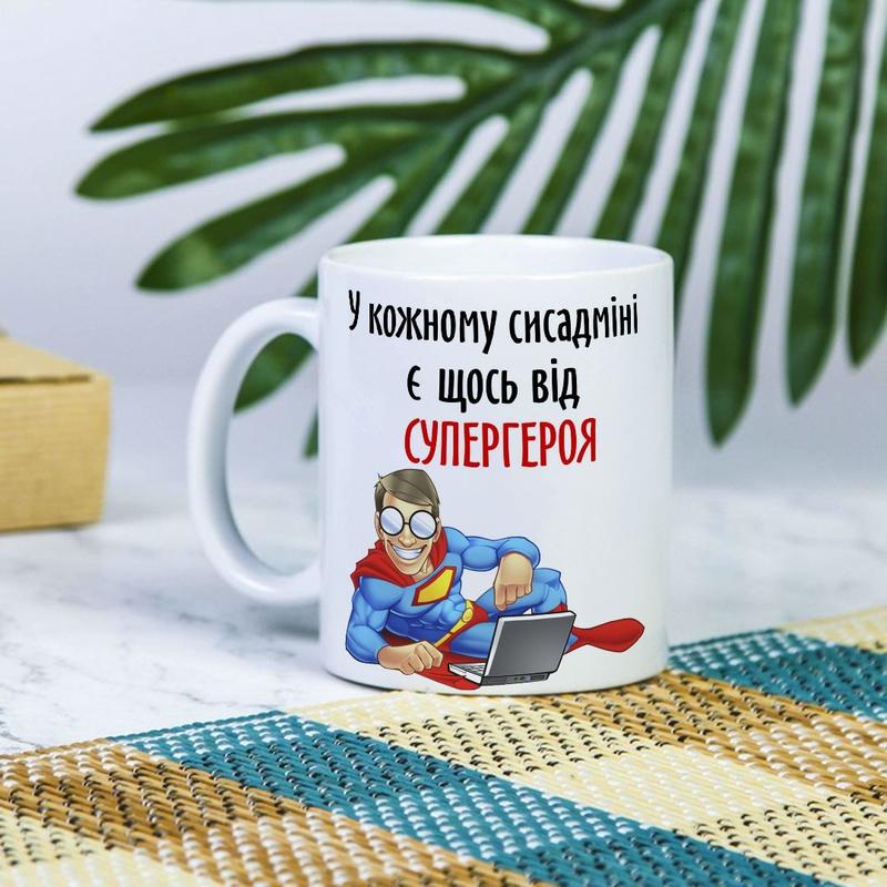 Белая чашка на подарок с надписью "в каждом сисадмине есть что-то от супергероя" 330 мл